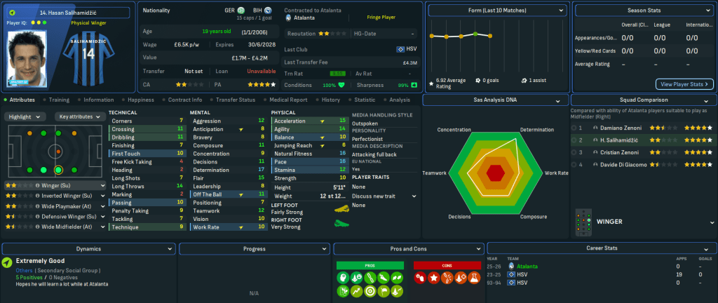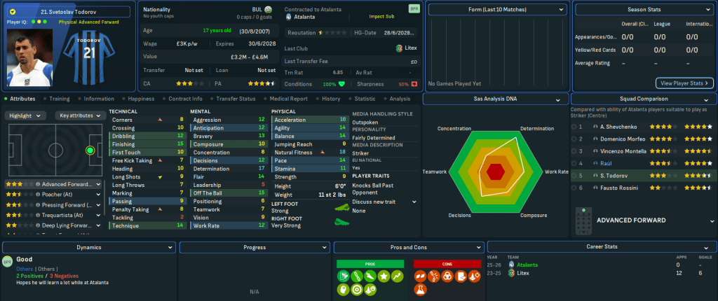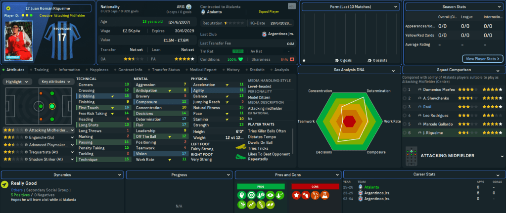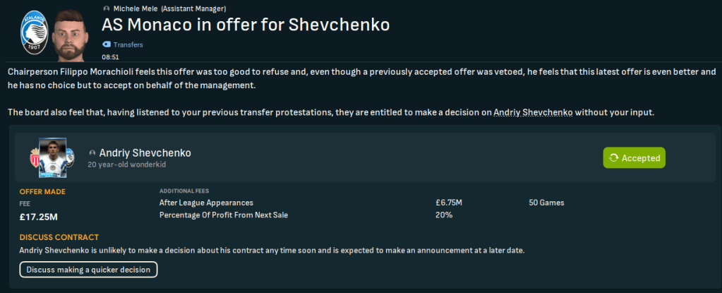 Lombardi’s mission took a major setback as the Atalanta board sold Shevchenko from under him. He’d previously protested a £12m offer, only for the chairman to accept an offer of up to £24m, which in fairness is the biggest deal worldwide in this save so far, a week later. He considered resigning in protest, which seemed a little extreme considering Sheva only scored 8 in 35 for the club. But it certainly raised questions about the manager’s long-term future, especially given Atalanta’s dodgy finances.