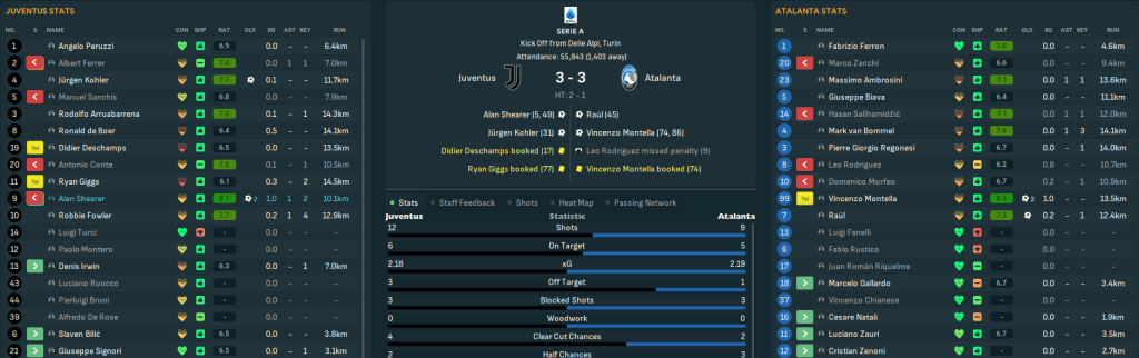The run-in began with the toughest possible test at a ludicrously good Juventus, who’d won every home game this season. Alan Shearer scored twice for the hosts but Raúl got a goal back just before half time and Montella’s late double earned a brilliant 3-3. Montella and Raúl both scored again as they eased past Bari 3-0 before Montella and Morfeo bagged braces in a 5-0 hammering of Brescia.