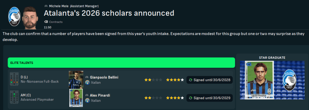 The third youth intake delivered two great talents in defender Gianpaolo Bellini, who was a bit of a Champ Man legend and made 396 league appearances for Atalanta, and Alex Pinardi.