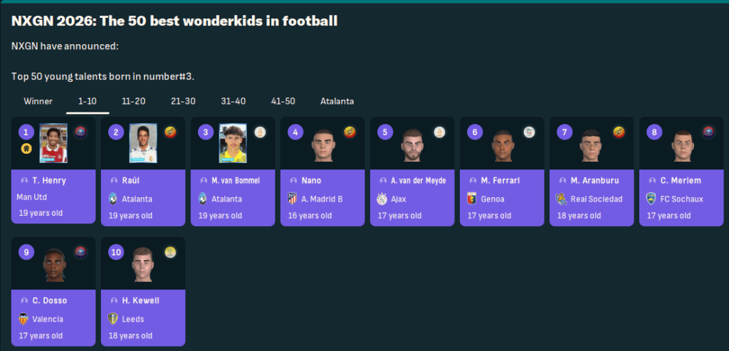 Raúl came 2nd to Henry in NxGn 1997 (2026) with van Biommel 3rd, academy product Pierre Giorgio Regonesi 16th and Riqeulme 36th. The list also included legendary regens like Andy van der Meyde, Harry Kewell, Diego Milito, Diego Forlán, Michael Bridges, Jamie Carragher, Geremi, Delron Buckley and Andriy Voronin.