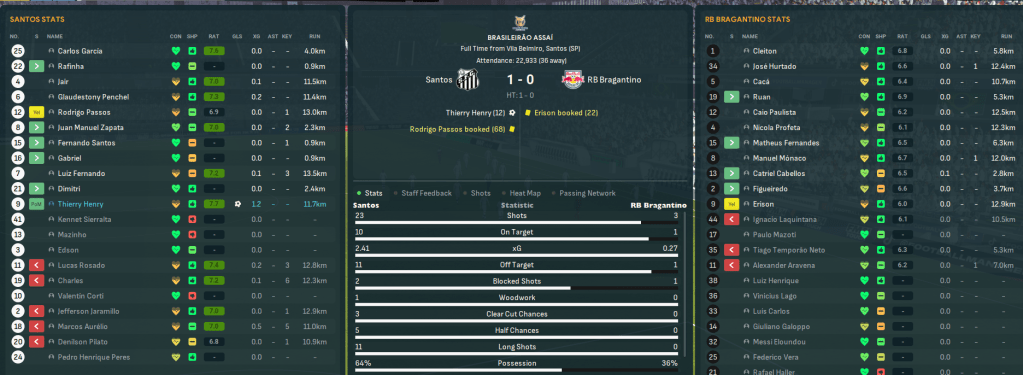 Game 2 – RB Bragantino (20th, home): Corinthians played first again and nicked another 1-0 away win at Gremio. Santos were gifted an opener against relegated Bragantino, whose centre back’s loose pass handed Henry his easiest goal of the season and his 100th league goal for Santos. The big striker had one disallowed then missed a huge chance before Aurélio hit the post and Rosado also had a goal disallowed. And, despite missing a host of chances, Santos secured a dominant 1-0 victory.