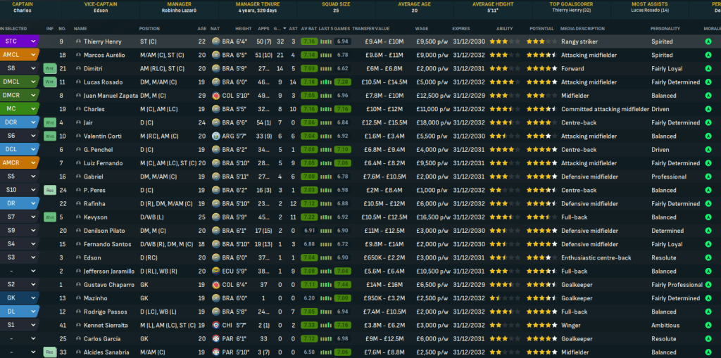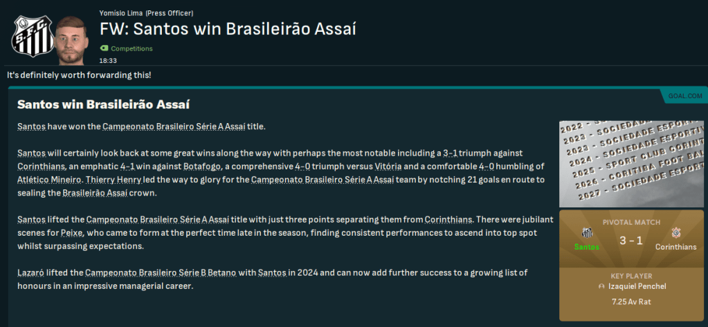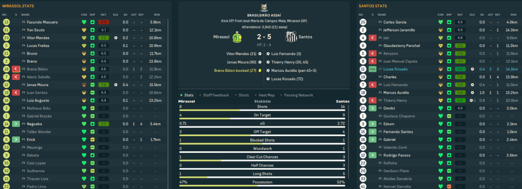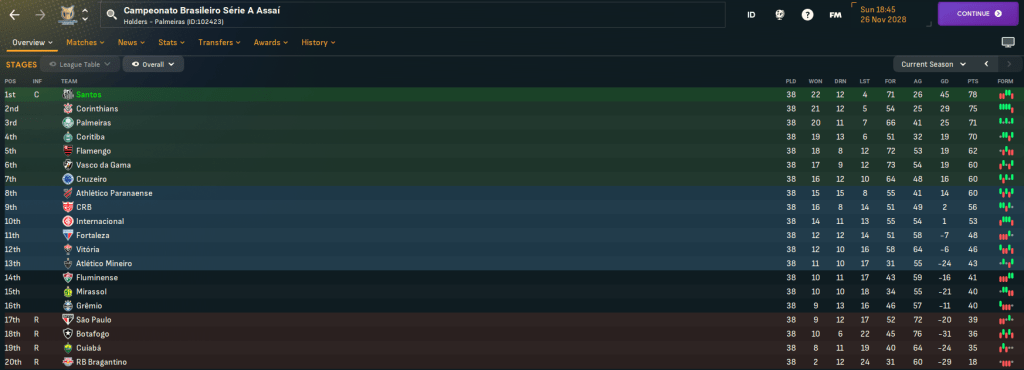 Santos won the league by 3 points from Corinthians, finishing with 78 points after 22 wins, 12 draws and 4 defeats, scoring 71 and conceding 26. Henry was the league’s top scorer for the 3rd time in 4 years with 21 goals, Aurélio led the league with 6 MOTM awards and he departed Penchel had the highest average rating of 7.25. Santos also had Kevyson, centre back Penchel, Jaramillo and Henry in the Série A team of the year.