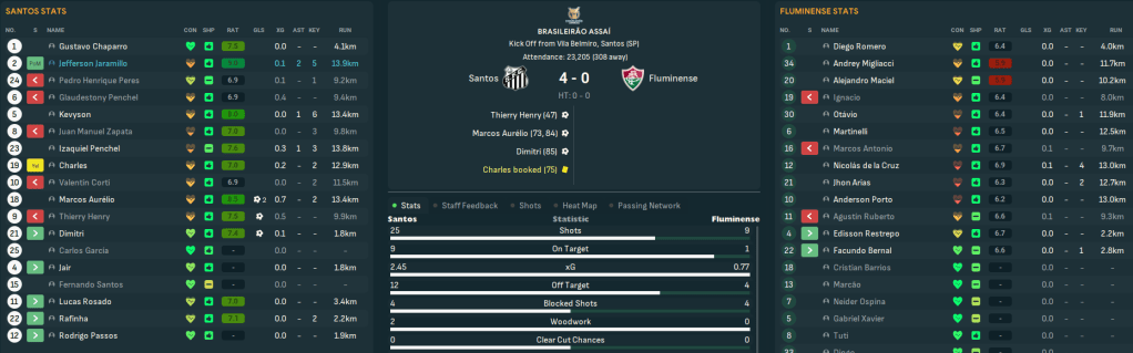 They began with solid 0-0s at Flamengo and Atlético Mineiro. Aurélio edged a 2-1 at home to Gremio and Valentín Corti and wonderkid midfielder Iqaquiel Penchel earned the same result at home to Vasco. But they hit top gear at Paranaense as Henry’s brace and Aurélio and Juan Manuel Zapata strikes saw them win 4-0. Another mass youth international exodus, plus right back Jefferson Jaramillo earning his first Ecuador cap, saw Santos lose for the first time at home to Cuiabá before a Zapata brace, which remarkably took him to 9 for the season, earned a 3-0 win at 4th-place Vitória and Aurélio’s double downed Fluminense 4-0.