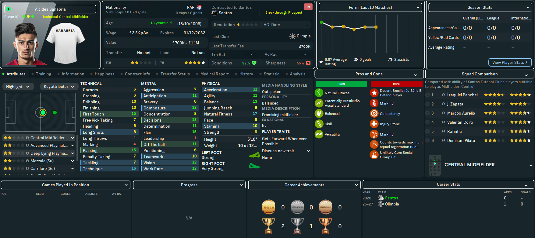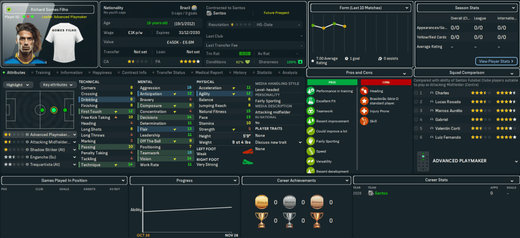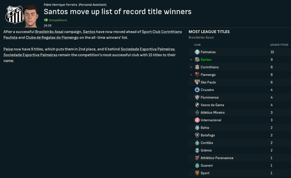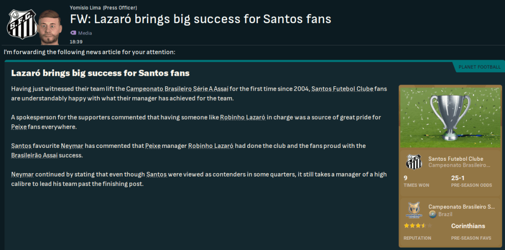 The bookies still didn’t fancy Santos’ chances, predicting an 11th-place finish with title odds of 50/1. Corinthians are 7/5 favourites, even though they’ve not won the title in this save, followed by Palmeiras (13/5), Flamengo (8/1) and Botafogo (20/1).