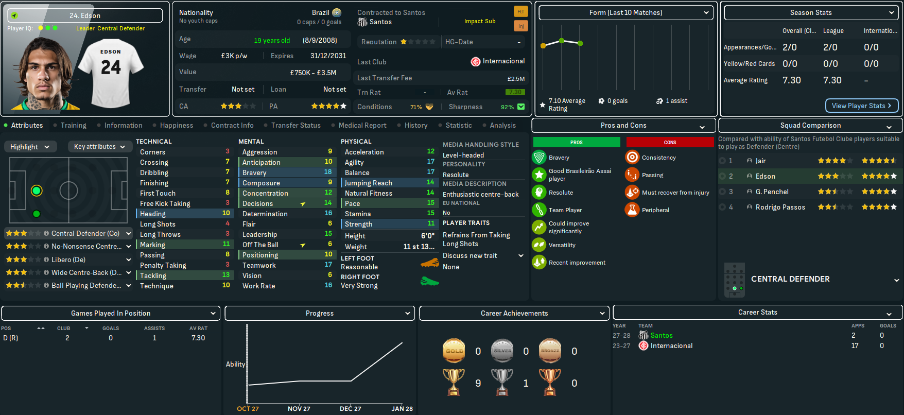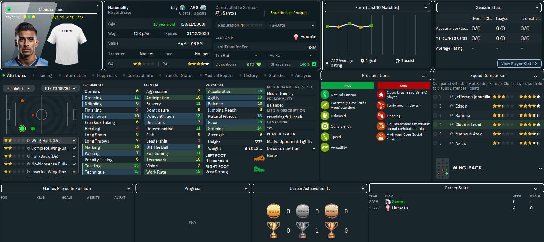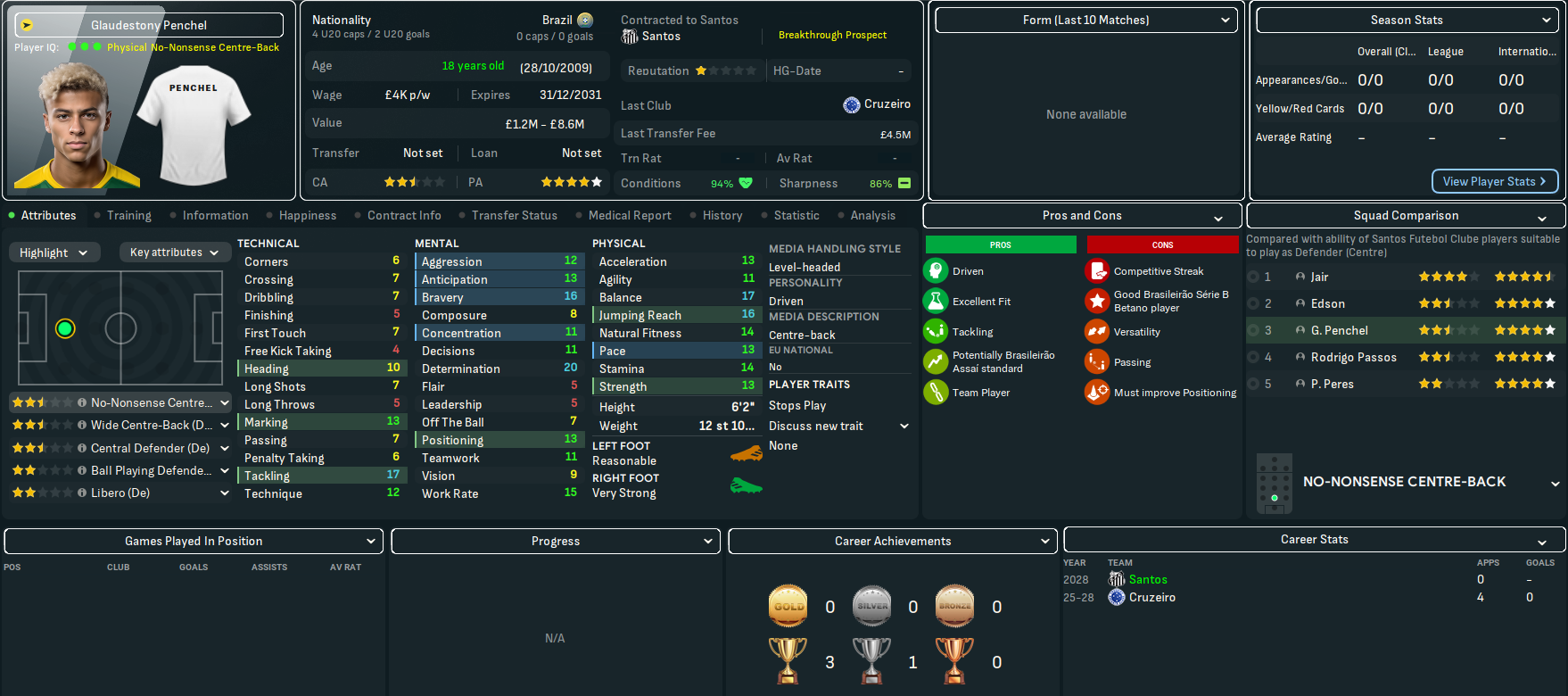 The bookies still didn’t fancy Santos’ chances, predicting an 11th-place finish with title odds of 50/1. Corinthians are 7/5 favourites, even though they’ve not won the title in this save, followed by Palmeiras (13/5), Flamengo (8/1) and Botafogo (20/1).