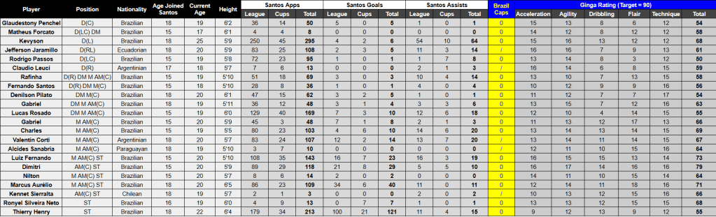 The Ginga tracker is now up to 22 players, led by Dimitri’s improved 79 rating followed by Fernando (73) and Aurélio (71). While Henry is the first player to pass a Ginga objective with his 121 goals for Santos. You can see all the players’ stats and ratings by clicking the chart below: