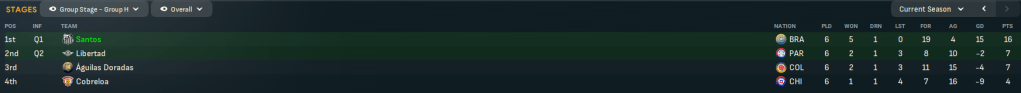 Santos’ improved league finish meant they went straight into the Copa Libertadores groups for the first time. And they got a favourable draw alongside Colombia’s Águilas Doradas, Chile’s Cobreloa and Paraguay’s Libertad. They opened up with Henry’s hat trick inspiring a 4-0 win at Libertad before a dominant 4-1 win at home to Cobreloa and Henry and Dimitri earned a comfortable 2-0 in Colombia. Qualification was sealed as Dimitri bagged a hat trick in a 5-1 thumping of Águilas before beating Libertad 3-1 at home and a fully rotated team drew 1-1 in Chile.