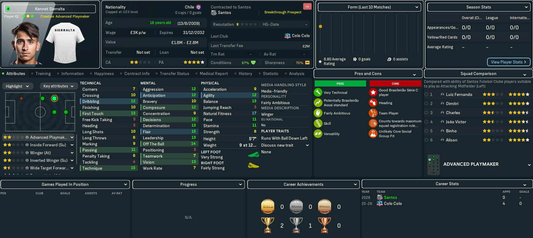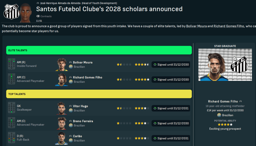 Rapidly improving youngsters led Santos FC to a first top-5 finish under Robinho Lazaró and the Copa Libertadores semis in 2027. They also dominated the awards for best young players, which proved the serious amount of potential at the club.