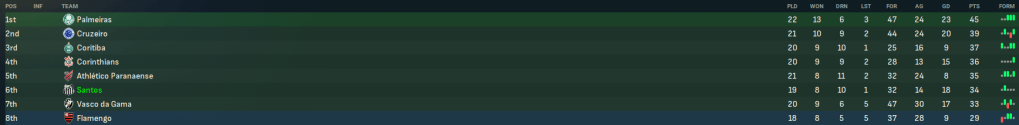 Santos had somehow played 3 fewer games than most of the teams around them. That meant playing 13 league games in July and August alongside a host of cup games, which wasn’t helped by 4 players going to the Olympics with Brazil U23s. So Lazaró had to regularly rotate where possible. A solid 0-0 at Palmeiras left them 7 points off the leaders, which became 4 as Henry’s brace inspired another 4-0 win over Botafogo. A tired team earned draws home and away against Fortaleza and at Corinthians. And they headed into their second half of the season in 6th place, 11 points behind Palmeiras with 3 games in hand. And the top 8 could become very tight.