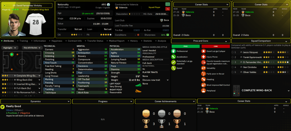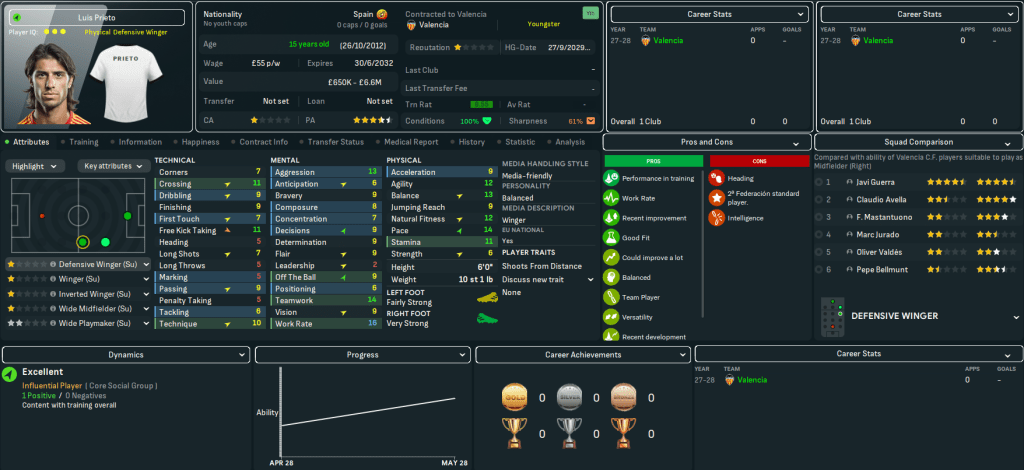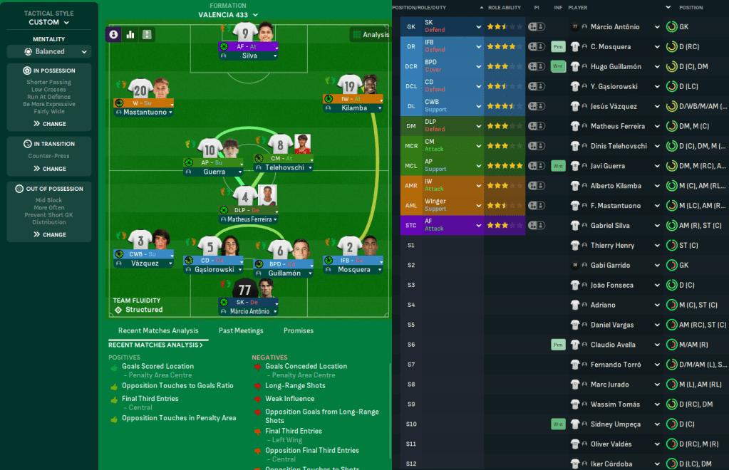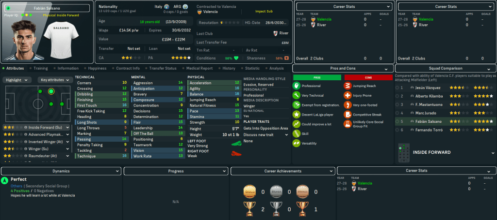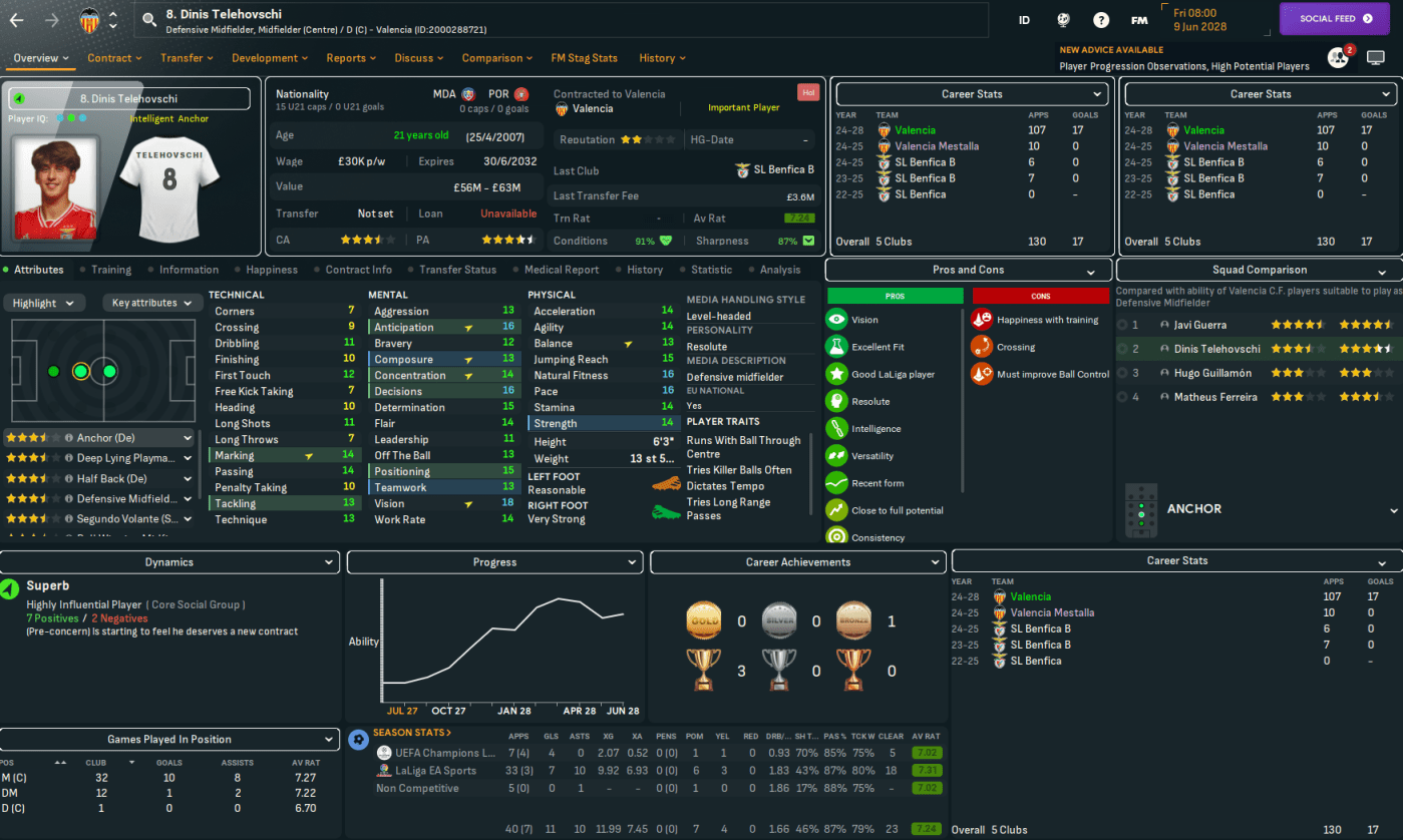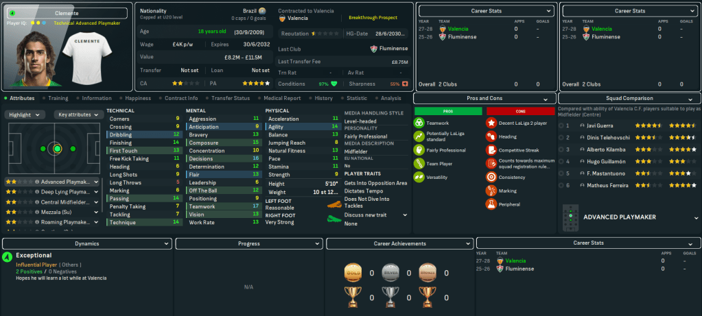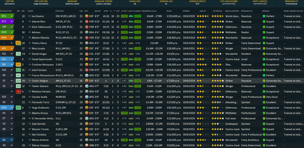 Lazaró’s first batch Ibero-American signings became homegrown at the club in the summer of 2027, including striker Gabriel Silva, winger Alberto Kilamba, who’s been labelled the next Ricardo Quaresma, midfielders Dinis Telehovschi and Matheus Ferreira and centre back Joao Fonseca. No new signings joined in the summer as Lazaró didn’t feel anyone he’d been scouting was any better than the homegrown players coming through the ranks. He also slightly tweaked his approach to a more traditional 4-3-3 to move Franco Mastantuono higher up the pitch.