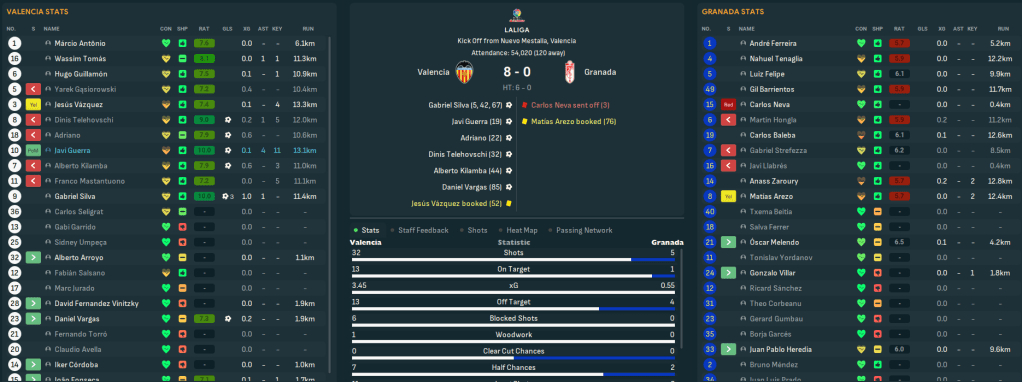 Valencia began Lazaró’s 5th season in charge with captain, club icon and star player Javi Guerra’s powerful 20-yard strike nicking a 1-0 win over Celta. Kilamba and Guerra edged a 2-1 win at Osasuna and Mastantuono edged another 1-0 home win over Villarreal. That provided the platform for a strong start, including Guerra scoring twice in a 4-0 thumping of Sevilla to send them top as the only unbeaten side after 15 games. And they headed into the new year still unbeaten with a 0-0 at home to Real, who they now haven’t beaten in 10 matches since their first meeting of the save, on New Year’s Eve.