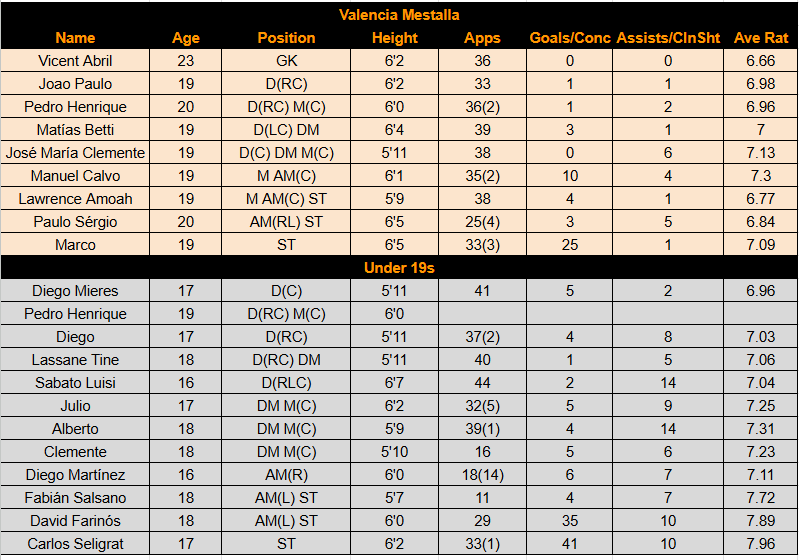 Valencia Mestalla had another good season, finishing 2nd to Castilla in Primera Federación Grupo II (Spanish 3rd tier) before posting to Depor in the playoff semi finals. The U19s won their División de Honor Juvenil group but disappointingly lost to Lugo in the quarter finals.