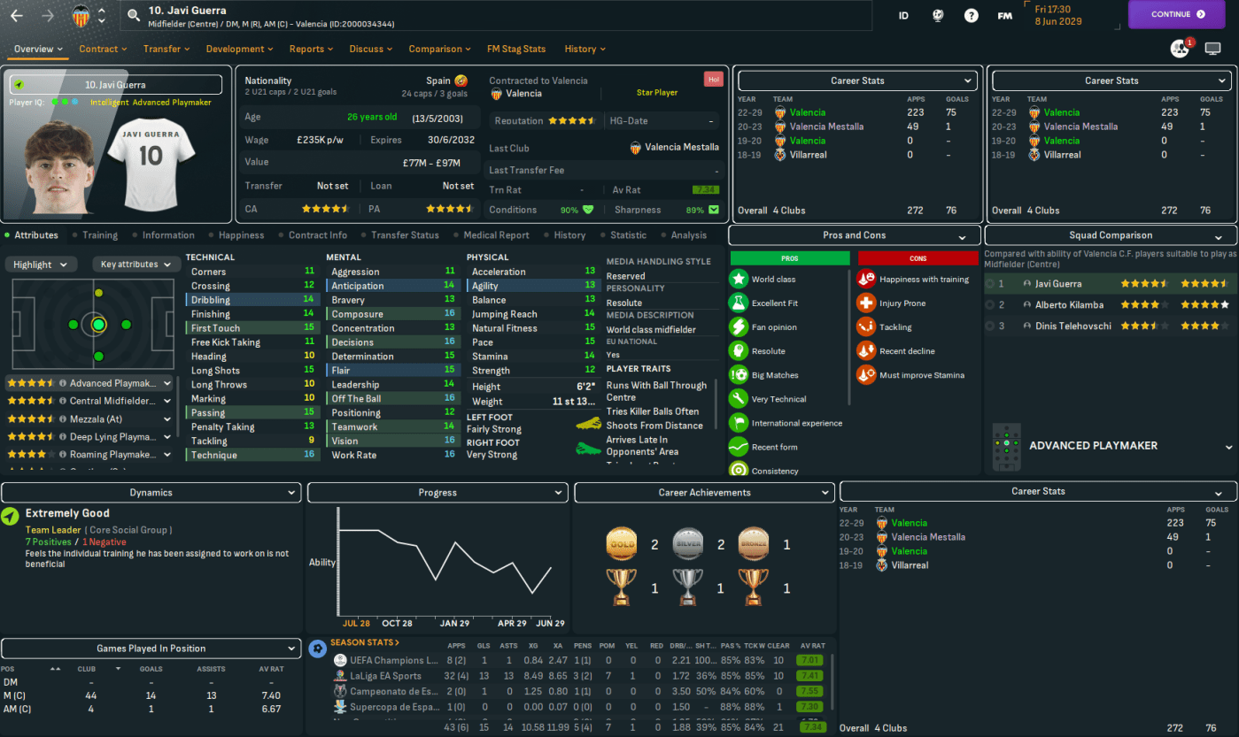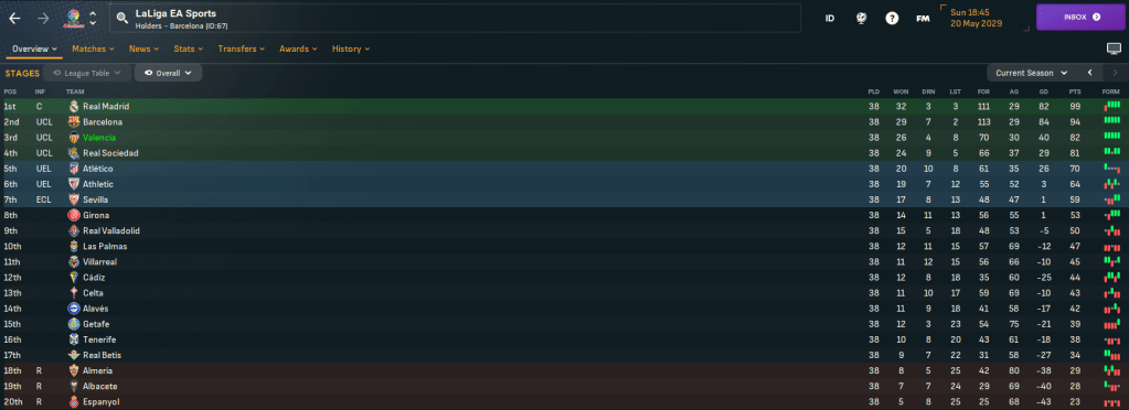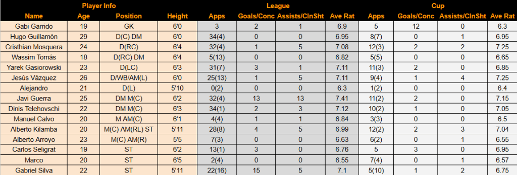 Valencia finished 3rd with 82 points after 26 wins, 4 draws and 8 defeats, scoring 70 and conceding 30 – which was 12 fewer points, 13 fewer scored and 7 more conceded compared to last season. Guerra got a league-high 13 assists and was the 4th-best player in the league with a 7.41 average rating. But Valencia were massively lacking a reliable goalscorer. Real won the title with 99 points followed by Barca on 94, who were 12 points clear of Valencia.