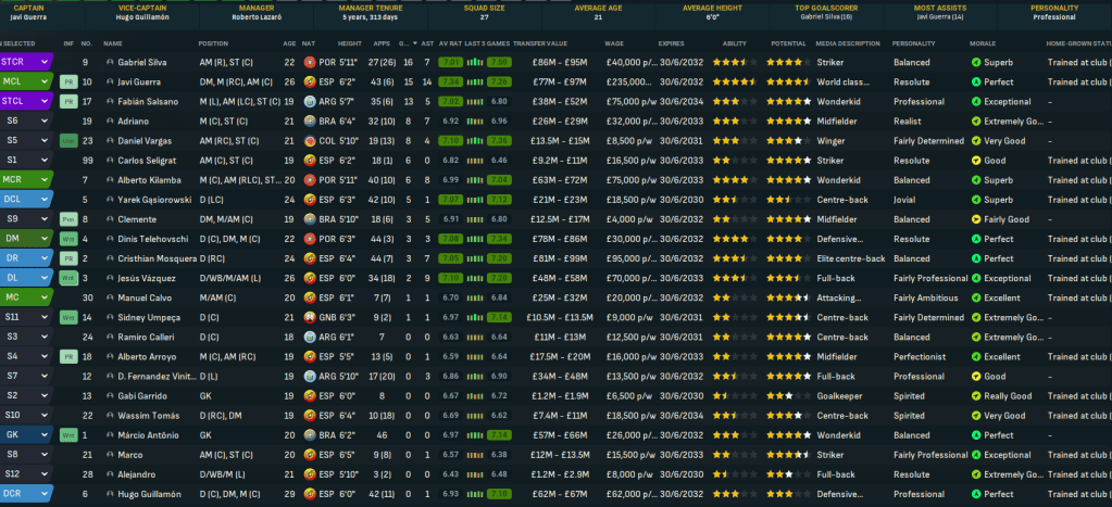 Silva top-scored with 16 in 53, which really isn’t good enough if Valencia want to challenge Spain’s big 2. Guerra was the star man again with 15 goals and 14 assists while the improving Fabián Salsano, who won NxGn 2029, scored 13 with 5 assists. But it was clear they needed more goal contributions from their attacking players.
