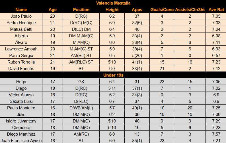 Valencia had 15 homegrown players play in the first team, playing a combined 353 league games with 43 goals (51 and 19 fewer than last season) and 154 cup games with 14 goals. Click the table below to see their stats in full: