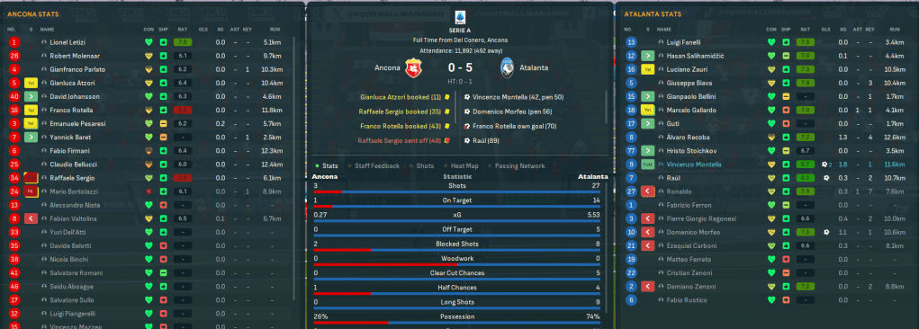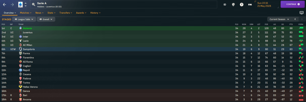 Atalanta celebrated the title in front of their own fans by putting 8 past bottom-side Anconca led by Montella’s hat trick. That saw them finish 1st on 88 points after 28 wins, 4 draws and just 2 defeats, scoring an incredible 128 (3.76 per game!) and conceding 48.