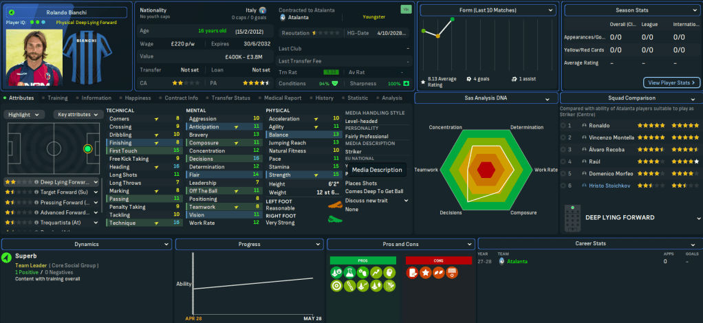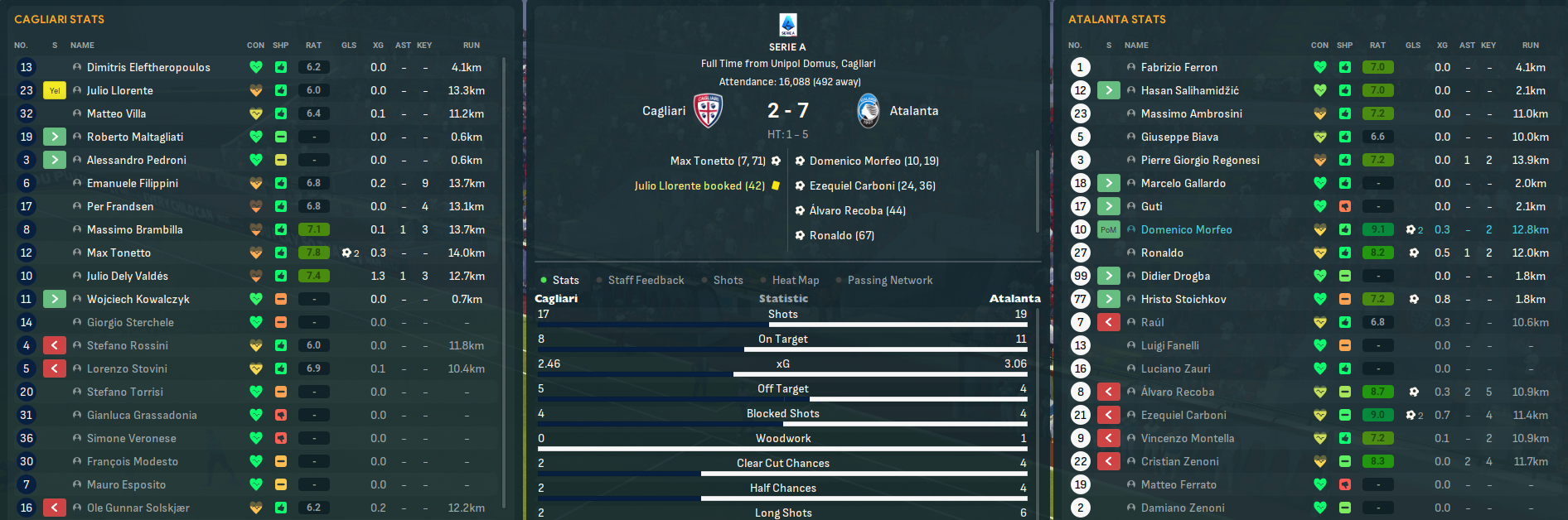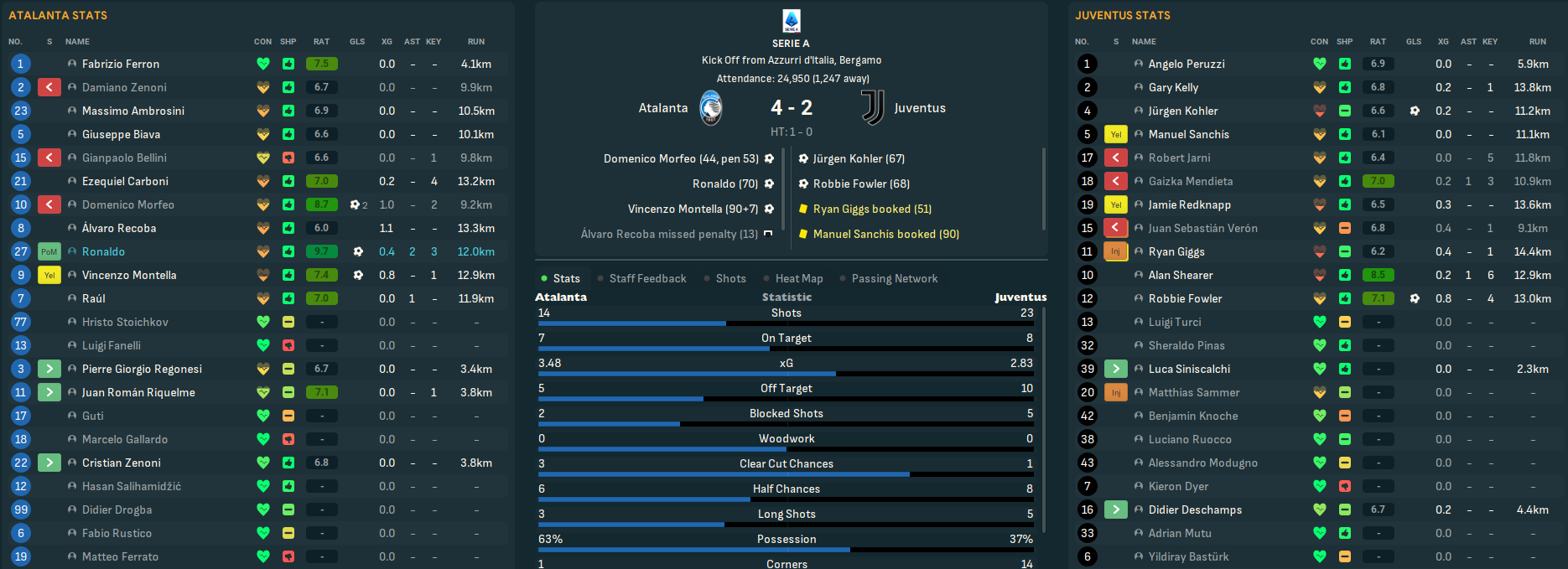 This was an unbelievable season for Atalanta as their ludicrous attack carried them to Italian glory. Recoba led the way with 30 goals, 14 assists and a 7.81 average rating in 31 games, followed by Montella (22 goals and 11 assists), Raúl (17 goals and 7 assists), Ronaldo (16 goals and 9 assists in 22 games), Morfeo (14 goals and 12 assists) and Carboni (11 goals and 11 assists).