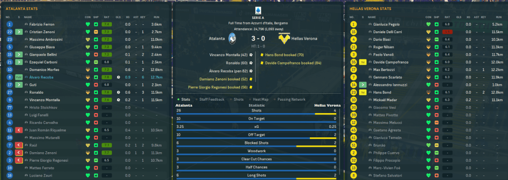 Game 3 – Verona (13th, home): Atalanta dominated Verona from the first kick, having 10 shots inside half an hour. But they eventually got in front as Montella turned 25 yards out and curled an unstoppable shot into the top corner. And Ronaldo made sure of the result with a powerful run before smashing past the keeper. Again, they prevented Verona having a shot on target and Recoba’s penalty sealed another 3-0 win – but it could have been 10. A couple of hours later, Juve hosted Lazio and won yet again to keep Atalanta 2 points clear and ensure the title was now a two-horse race.