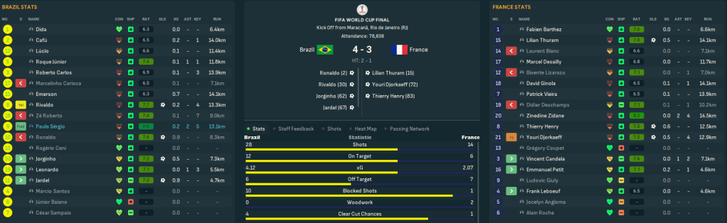 The summer saw the World Cup in France and, just like in real life, the hosts made it to the Final to take on Brazil. In real life, the Ronaldo saga saw Brazil crumble to a 3-0 defeat. But in this universe, Ronaldo scored after 2 minutes, Thuram equalised before Rivaldo, Jorginho and Jardel put Brazil 4-1 up, and Djorkaeff and Henry gave France some hope. But Brazil lifted their 5th World Cup in a 4-3 thriller. Italy made it to the semis but lost 1-0 to France, who also beat England 2-1 in the quarter-finals.