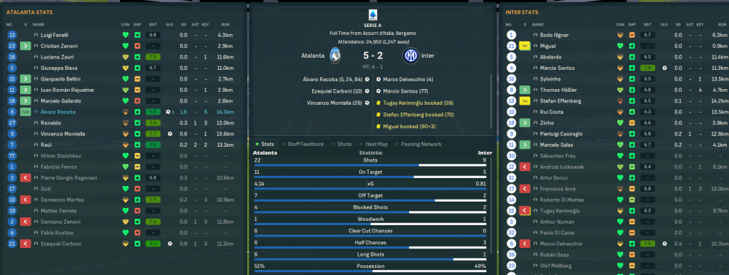 That win took Atalanta top of Serie A for the first time heading into 1999 (2028), with a 2-point lead over Milan and Inter and a 4-point gap to Juve. They began the year at home to Inter, who obviously scored their first shot from a corner then got ripped apart by their real-life players as Recoba equalised, Ronaldo created a 2nd for Carboni and Recoba bagged a 2nd before Montella made it 4 inside 26 minutes! Inter scored another corner fluke but Recoba wrapped up yet another hat trick late on.