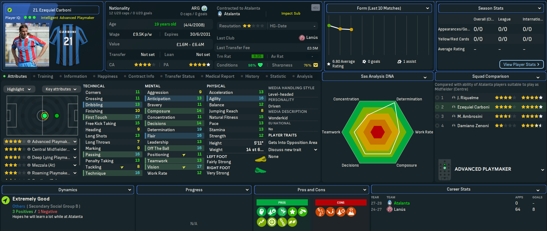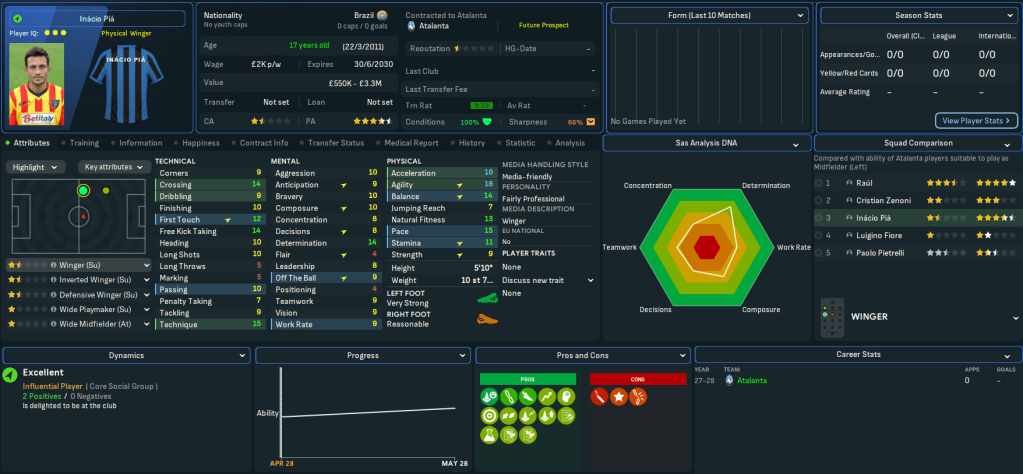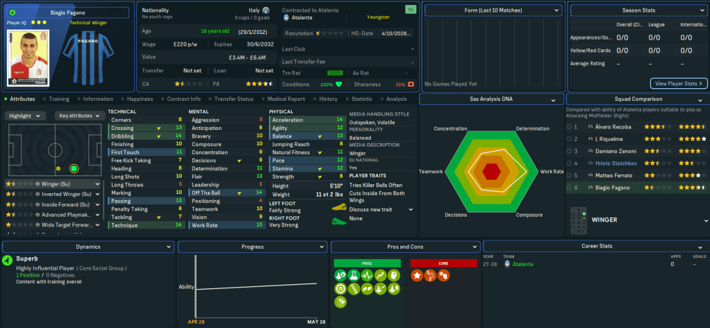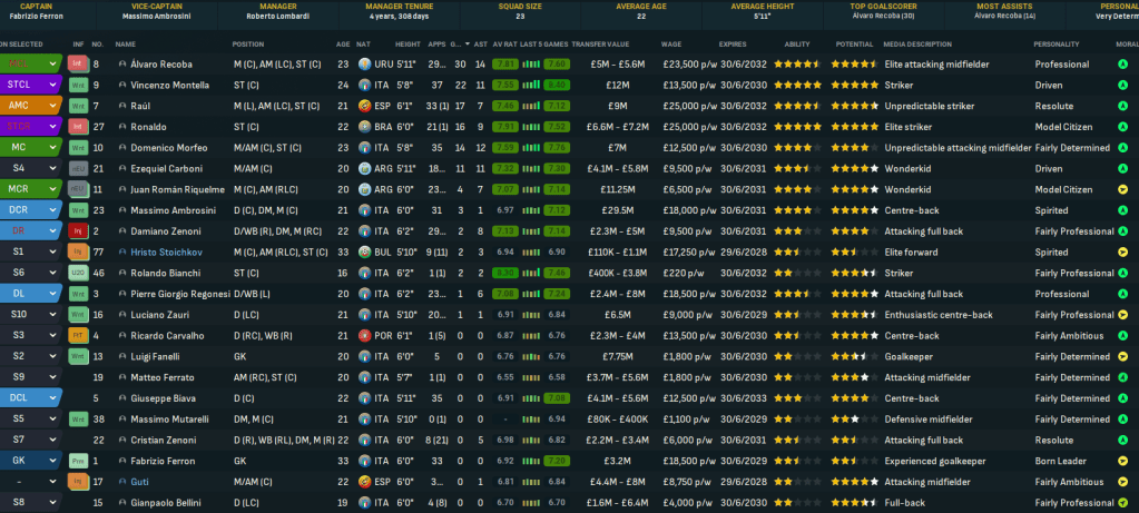 The latest youth intake delivered 3 regens with decent potential in striker Rolando Bianchi, who briefly played for Man City before scoring 71 in 169 for Torino, and wingers Inácio Piá, who went on to play for Napoli, and Biagio Pagano, who became a lower league journeyman.