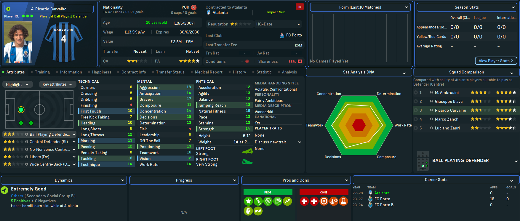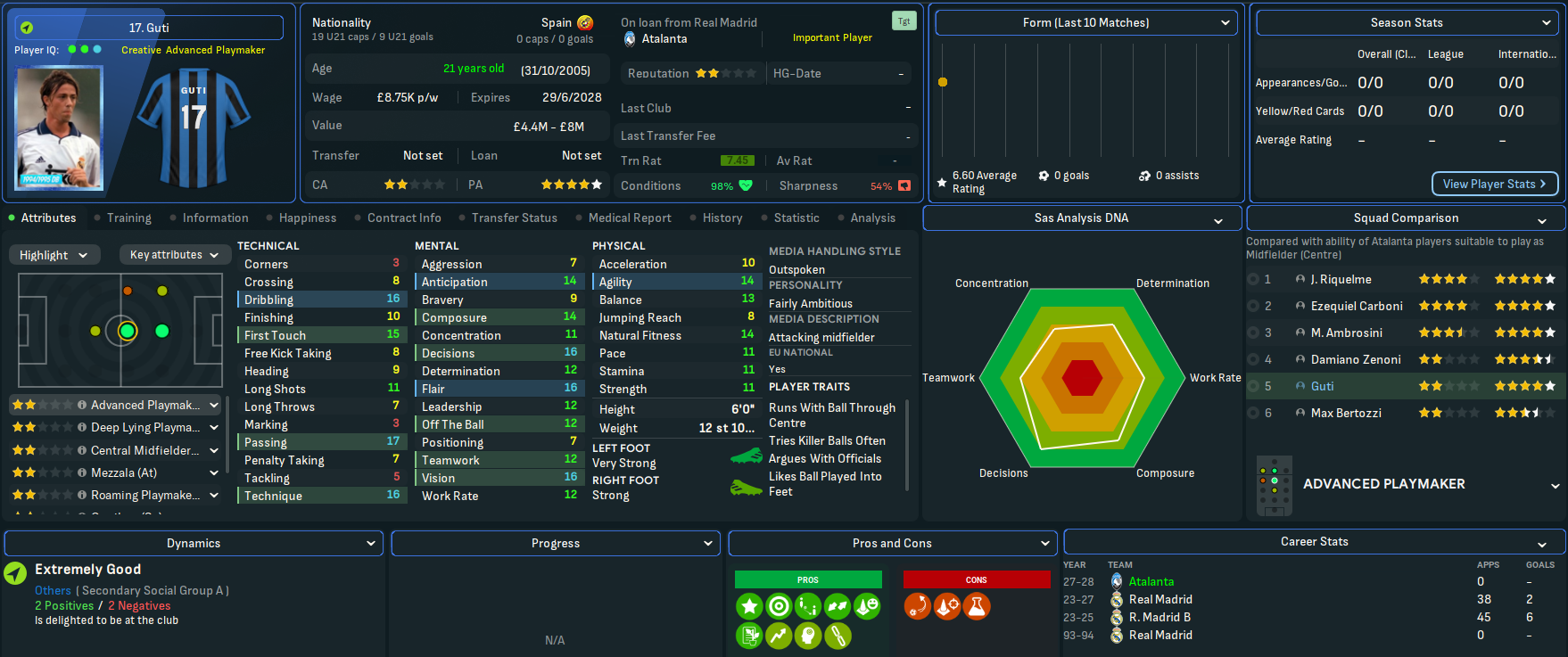 That ludicrous attacking duo was joined by centre back Ricardo Carvalho for £5m from Porto and exciting midfielder Ezequiel Carboni, who played for RB Salzburg and Catania and is the father of FM24 wonderkid Valentín, for £3.5m from Lanús. However, Carvalho broke his leg on international duty in July and will miss up to 8 months! Lombardi broke from his youth policy to bring in legendary striker Hristo Stoichkov on loan from Barcelona and loaned in Raúl’s mate Guti from Madrid.