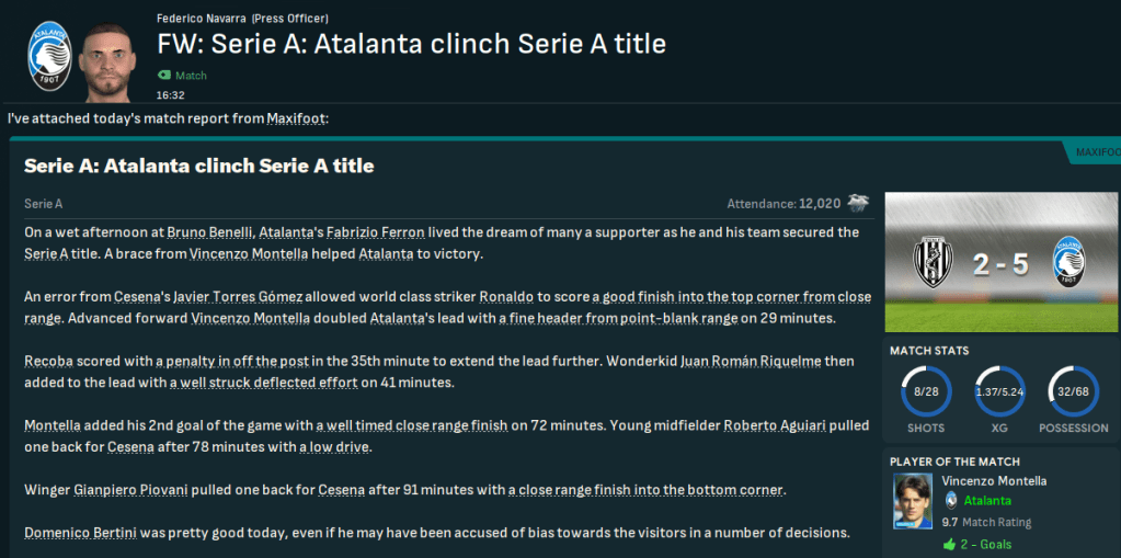 Game 4 – Cesena (12th, away): Milan’s win meant Atalanta needed 1 point to win Serie A for the first time, as they had a better head-to-head record against Juve. They should have been in front after 22 seconds at Cesena as Morfeo’s shot was pushed over, then Massimo Ambrosini’s header was pushed wide from the resulting corner – and after 90 seconds, they already had 0.6 xG. They absolutely dominated and eventually went in front as Montella sent Ronaldo through to finish then quickly doubled the lead from Cristian Zenoni’s parried shot. That made it party time and Ronaldo won a penalty that Recoba converted, Riquelme smashed home – making it 4-0 at the break after 18 shots, 3.23 xG and 72% possession. More of the same followed after the break and Montella tapped home a 5th before slacking off late on. Atalanta were Champions of Italy for the first time!