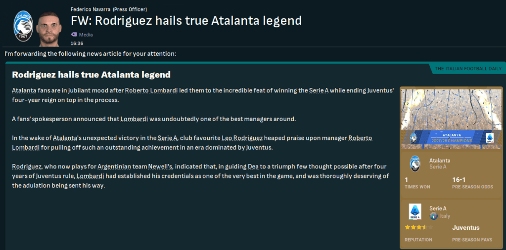 Lombardi was really excited by his improved squad, but the bookies still only fancied them to finish 7th with title odds of 25/1. Juve remain massive 11/10 favourites followed by Roma (15/2), Lazio (8/1), Inter (9/1) and Milan (11/1).