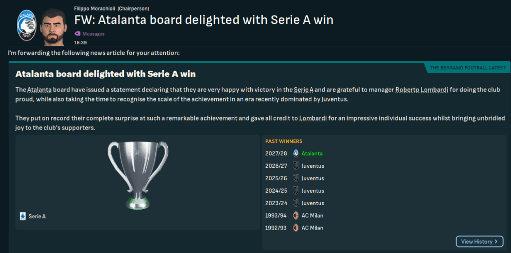 The Atalanta board wanted Lombardi to win the UEFA Cup. However, they got a tough 1st round draw against Valencia and lost 2-1 away. But the home leg was farcical with 13 first-team players on international duty. And a team of reserves did well to draw 1-1 but go out at the first time of asking.