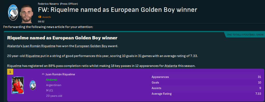Riquelme became the first Atalanta player to win European Golden Boy. But Ronaldo became the first to make the Goal50 list, coming in at 26th, while Juventus had the top 3 of Shearer, Fowler and Giggs.