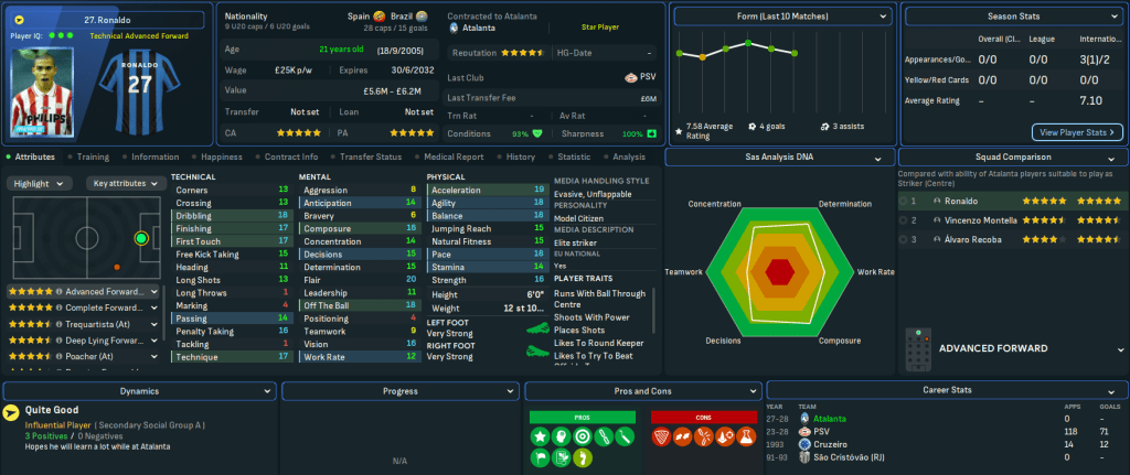 As teased in Part 5, this summer’s big-name signing was supposed to be former loanee Raúl, who signed for just £4.5m from Real Madrid. However, on deadline day, Lombardi noticed that superstar Ronaldo, who was strangely still at PSV, was finally interested in a move. And, despite having to include a £9m minimum release fee, he got the deal done.