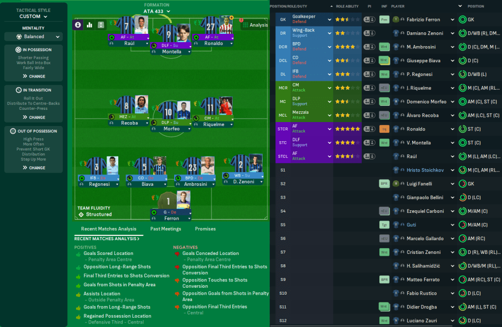 Lombardi had an international break to work out how to get Ronaldo and Raúl into a team alongside the outstanding Vincenzo Montella, Álvaro Recoba and Domenico Morfeo. Before Ronaldo’s arrival, he’d created a very attacking 3-4-1-2. But he took that up a level and ditched the 3 at the back to go with a silly 4-3-3 – with Morfeo and Recoba having to learn deeper positions that suit their attributes. However, Lombardi did tinker with dropping Raúl into the hole and kept last season’s successful 3-4-3 approach in the back pocket, just in case it all went horribly wrong.