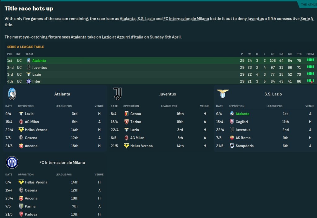 Atalanta kept the good form going, including Montella scoring twice in a 5-0 win over Cagliari to become the club’s all-time record league scorer with 104 goals. A slightly more defensive approach saw them hold on for a 1-1 at Juventus and late Recoba and Raúl strikes sealed a 4-1 win over Roma. That took Atalanta into their first-ever title race, leading Juve by 4 points, Lazio by 5 and Inter by 9.