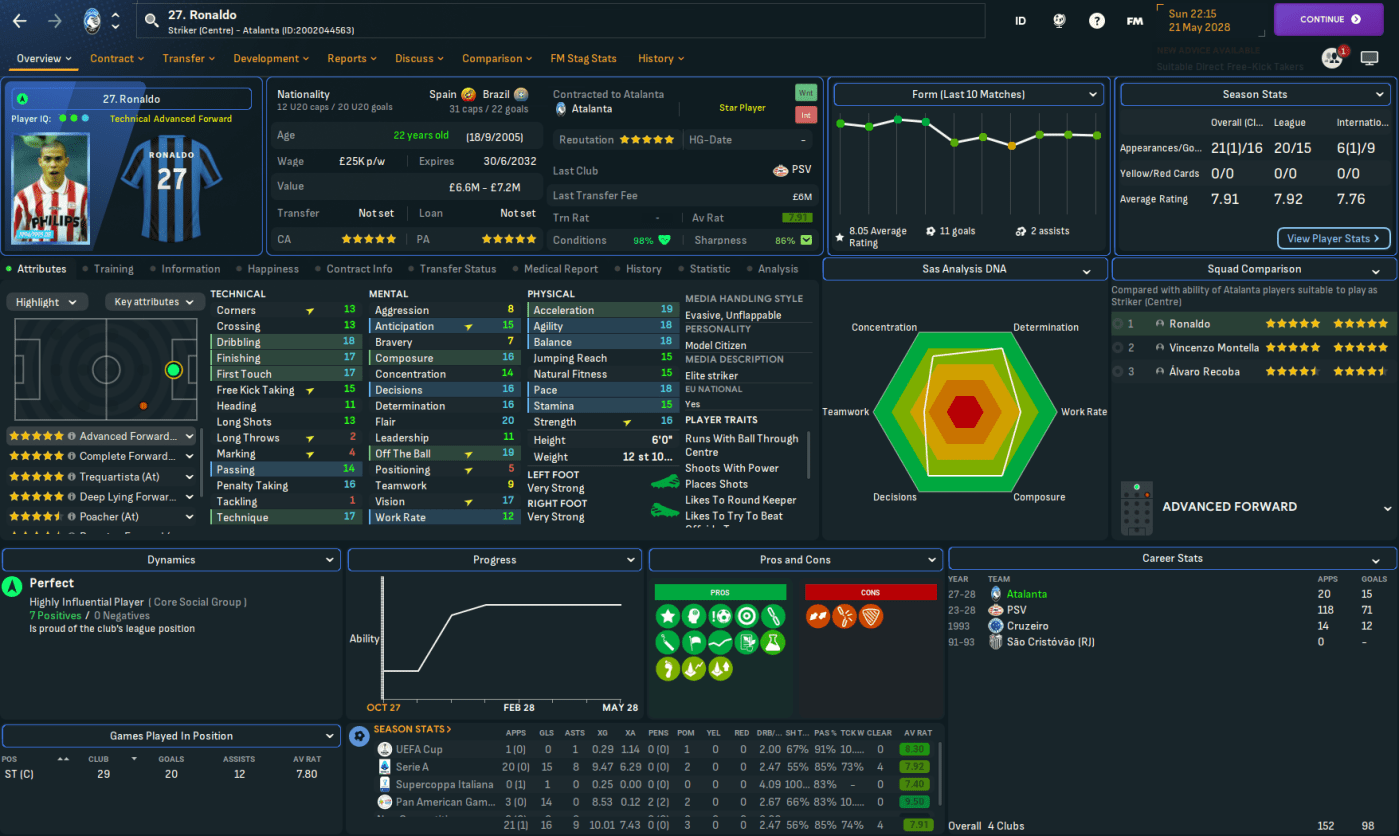 As teased in Part 5, this summer’s big-name signing was supposed to be former loanee Raúl, who signed for just £4.5m from Real Madrid. However, on deadline day, Lombardi noticed that superstar Ronaldo, who was strangely still at PSV, was finally interested in a move. And, despite having to include a £9m minimum release fee, he got the deal done.
