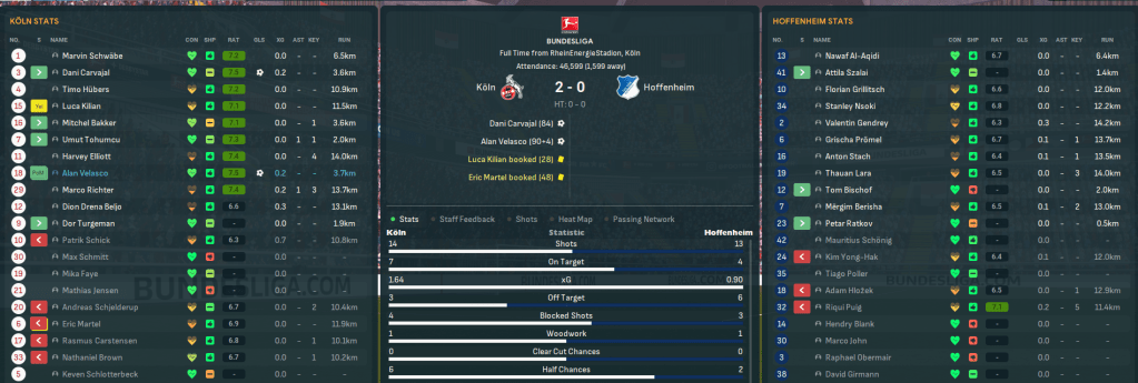 Köln began March with three huge games against the teams below them. First up, they went to 16th-place Union Berlin and played poorly but held on for a 0-0, which oddly took them to 10 away games unbeaten. Next was a must-win home game against bottom side Hoffenheim and Köln had the best of a tight clash but struggled to break through. However, substitutes turned the game with two late goals as Carvajal got in for his 1st for the club and Richter crossed for opposite winger Velasco to double the lead.