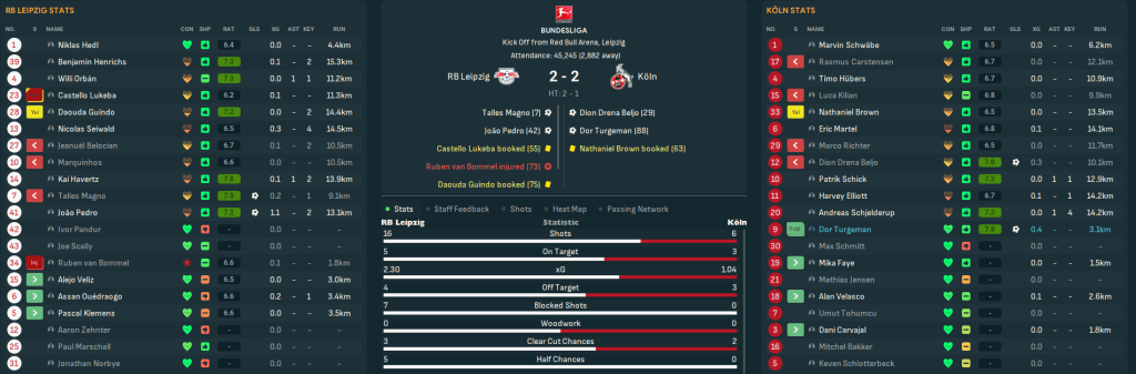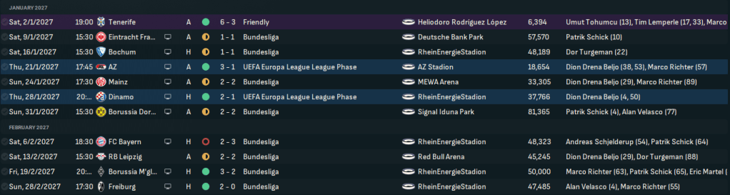 Schick hit the ground running with a debut goal to earn a point at Frankfurt before another 1-1 at home to high-flying Bochum and Beljo got his first goal to secure a 2-2 at Mainz. Schick opened the scoring in a more impressive 2-2 at Dortmund, which lifted Köln off the bottom of the table for the first time since August. That game was the first in a difficult triple header, which saw Köln a little unlucky to lose 3-2 at home to Bayern then claim an impressive 2-2 at Leipzig.