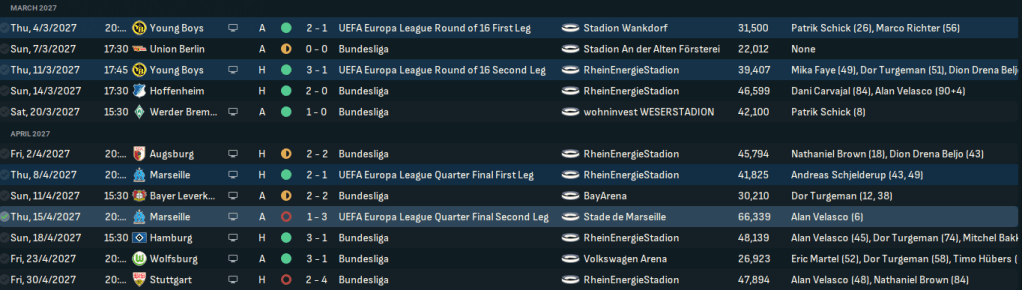 An excellent performance at home to Hamburg eased relegation concerns. Velasco struck just before the break, Hamburg undeservedly equalised, but Turgeman and Bakker strikes ensured an easy 3-1 victory. And they lost Beljo for 3 weeks, taking their injury count to 7 first teamers! Their good form continued as second-half Martel, Turgeman and Hubers goals earned a 3-1 at Wolfsburg, making them virtually secure against relegation before losing 4-2 at home to Stuttgart. In Europe, Köln breezed past Young Boys 5-2 and then beat Marseille 2-1 at home, but an injury-ravaged team lost 3-1 away.
