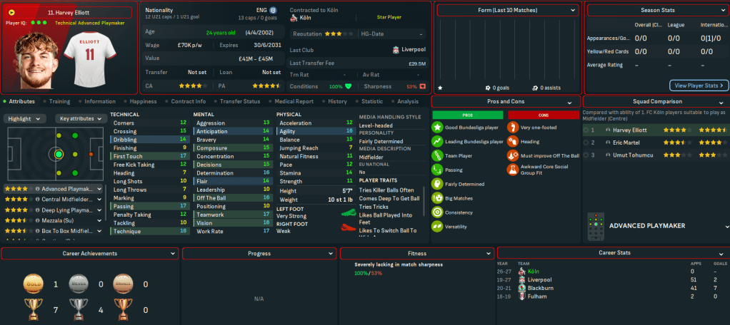 The main positive about joining Köln was a £40m transfer budget, which was boosted by selling 21 players for £10m. Big Sam addressed the lack of goals by snapping up two big strikers, 6ft 3in Patrick Schick for £2.1m from Leverkusen and 6ft 5in Dion Drenja Beljo for £3.8m from Augsburg. He also loaned in winger Andreas Schjelderup from Lyon, playmaker Mathias Jensen from Brentford, and centre back Mika Faye from Atlético, then snapped up right back Dani Carvajal for £275k from Real Madrid for the final 6 months before he retires and left back Mitchel Bakker for £2m from Fiorentina. But the signing of the window may be Harvey Elliott for an initial £11.75m from Liverpool.