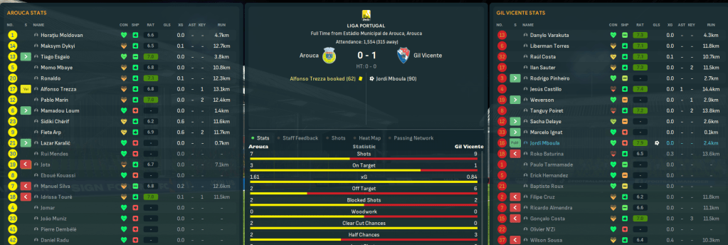 Game 4 – Portimonense (13th, home): Those results kept Gil Vicente 5 points clear of Vizela in 17th and 2 points clear of Estrela Amadora in 16th. Leiria thumped Arouca 4-1, Amadora lost 1-0 at home to Pacos and Vizela hammered Anadia 5-0. So a win at home to Portimonense would secure Gil Vicente in the top tier. They absolutely dominated the first half by 10 shots to 2… but obviously conceded the first they faced. But they kept going as Big Sam went ultra attacking for 60 minutes and eventually got the goal they deserved.