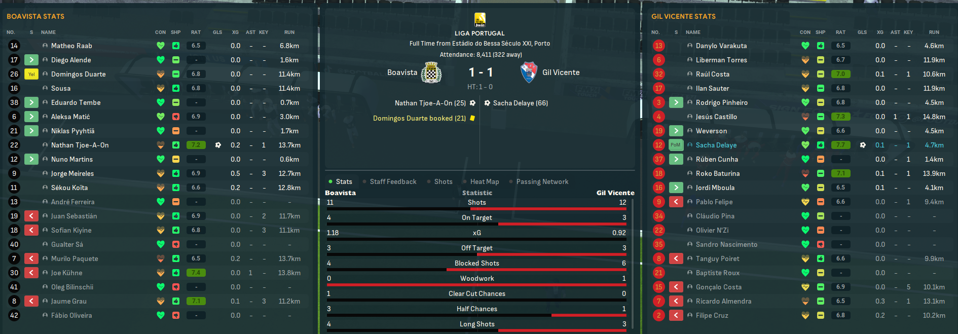 A few days later, they made the trip to Boavista, started brighter but went behind to a fluky deflection from a corner. But Delaye made an instant impact, scoring 6 minutes into his debut off the bench, and they settled for a point.