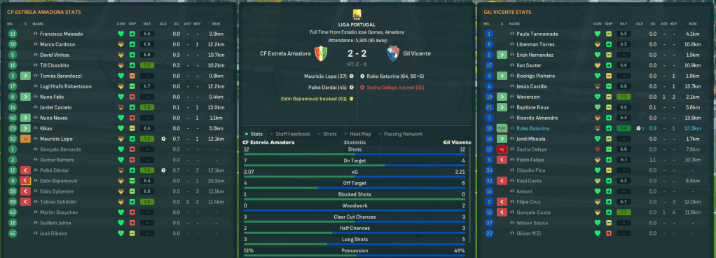 February began with another big game at a fellow strugglers as Gil Vicente travelled to 15th-place Estrela Amadora. The visitors began on the foot front and Felipe somehow missed an open goal from 6 yards out, and they folded to concede twice just before the break. But Big Sam laid into his team and got a response, which saw Baturina head them back into the game. Then, deep into injury time, sub Weverson whipped in a cross for the big man to head a dramatic equaliser!
