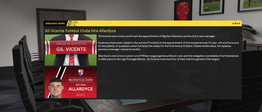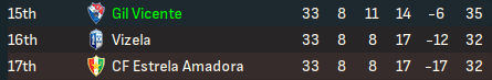 Game 5 – Vizela (16th, home): That teed up a final-day battle as Estrela Amadora, Vizela and Gil Vicente looked to avoid relegation. Gil Vicente led both their rivals by 3 points and had a 6-goal and 11-goal advantage. Amadora were basically doomed to the bottom 3, but a 3-goal defeat at home to Vizela would see Gil Vicente join them. A team meeting went well, for a change, and Big Sam was quietly confident his team would get the required result.