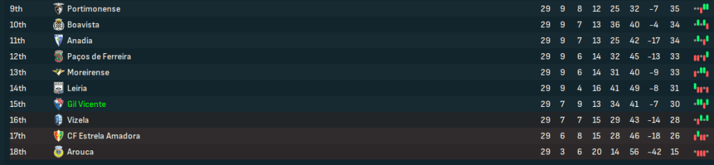 They took the positives from that result into demolishing Pacos de Ferreira 4-0 thanks to young striker Wilson Sousa, who’d been promoted after an injury crisis, bagging a hat trick. That dragged Gil Vicente out of the bottom 3 for the first time all season, 2 points ahead of Estrela Amadora with 7 games remaining. They crashed down to earth with a 4-1 hammering at Leixoes but Amadora also lost at Portimonense. March ended with another critical game at home to a resurgent Boavista, who were now 9th. But a much-improved performance saw Sousa score the opener in a 2-1 win, while Amadora drew with Leiria.