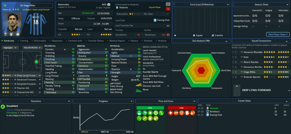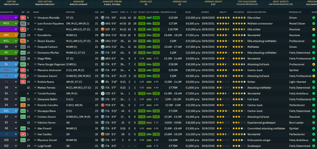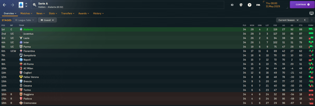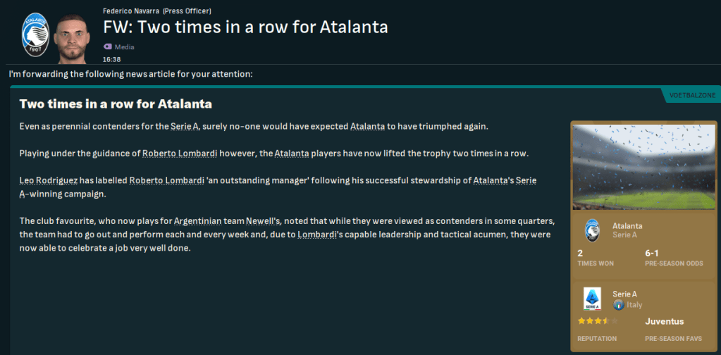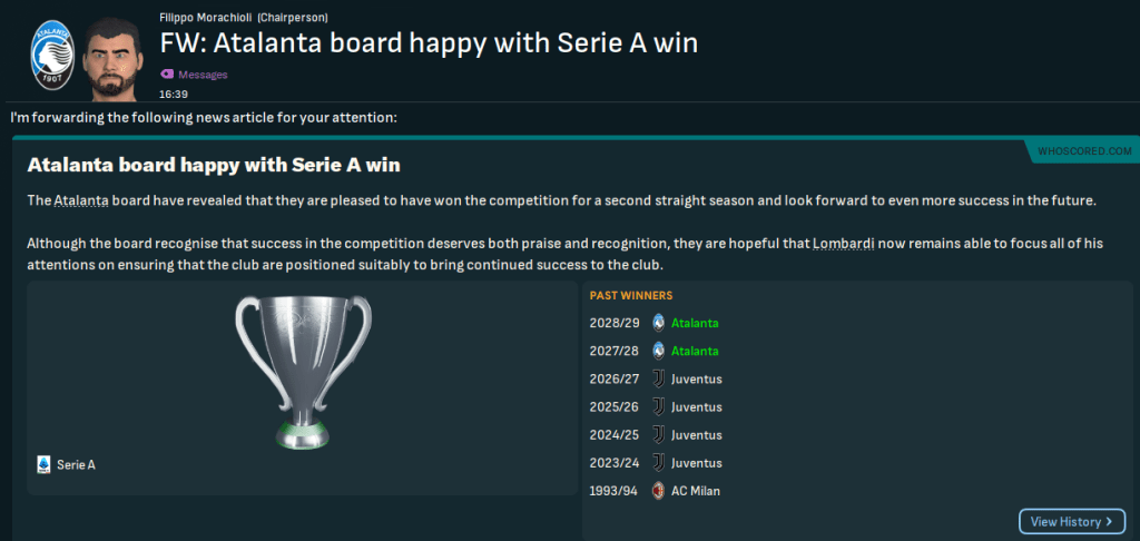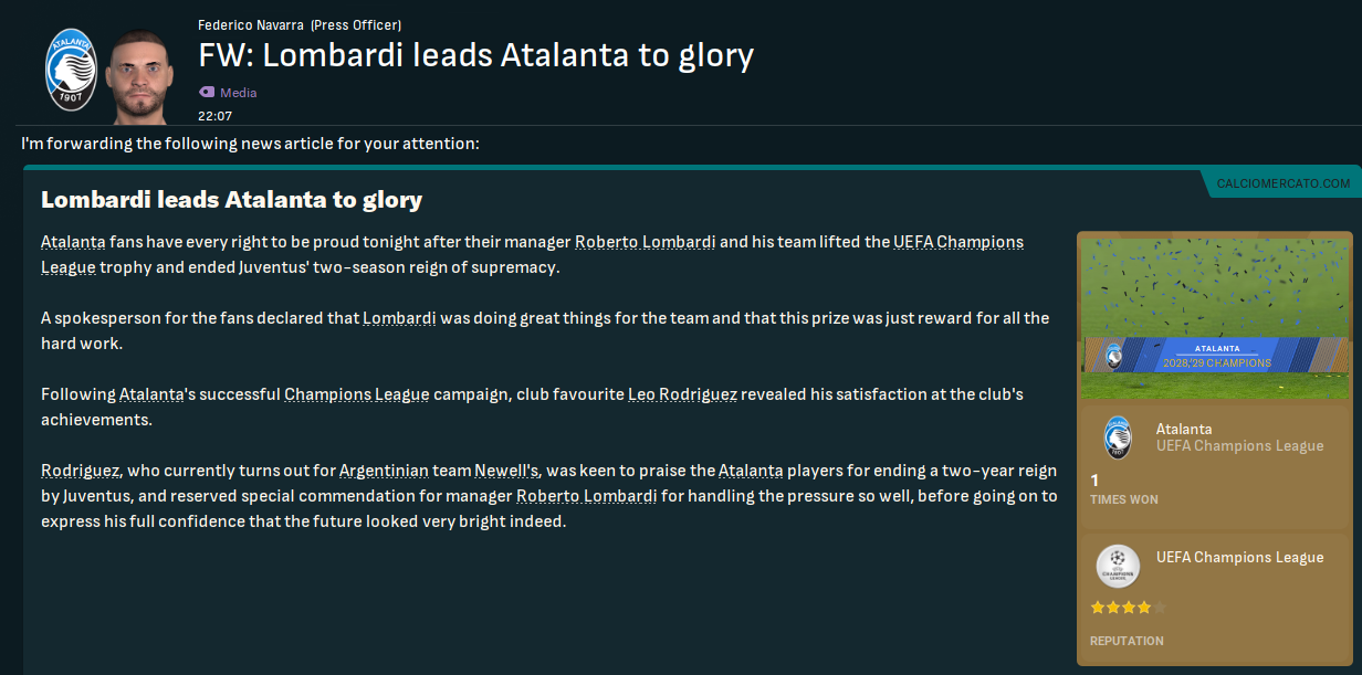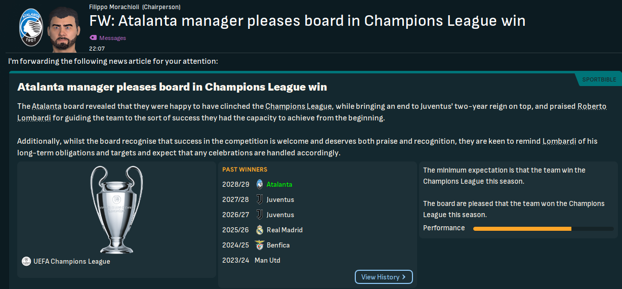 Lombardi’s CL success saw him become an iconic figure at Atalanta, behind the legendary Montella and Recoba. This save has been but a lot of fun. However, I can’t handle the unexplainable dwindling finances (we somehow ended the season with £1m in the bank despite turning a transfer profit), the number of teams coming in for players every summer, and other teams making offers for all our staff members. So it makes sense to leave Atalanta on a high.