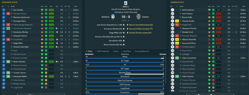The Champions League Final proved just how good this Atalanta side was but, more specifically, how good Montella was. The Italian has clearly become the best striker in the world, despite what the game might think. He topped the goalscoring chart with an amazing 46 plus 10 assists in 46 games. Riquelme was also incredible with 19 goals and 28 assists, Raúl got 19 goals and 9 assists, Ronaldinho got 16 goals and 8 assists, Recoba got 14 goals and 20 assists, Carboni got 11 goals and 13 assists and Morfeo got 9 goals and 13 assists.