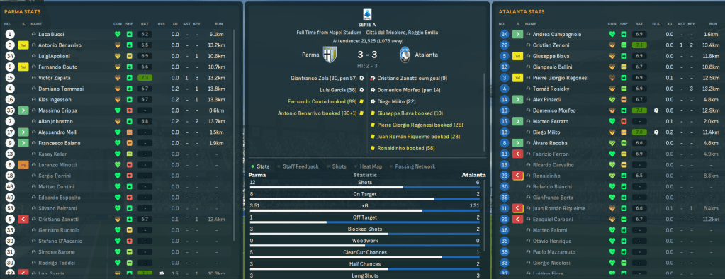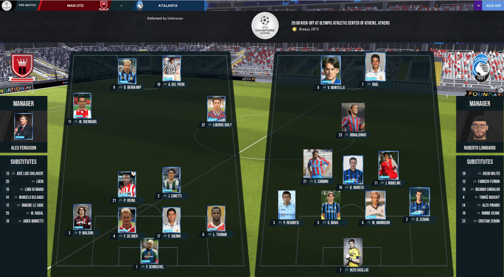 Atalanta came out flying as Montella flew down the left and passed inside for Carboni, who turned and curled delightfully into the top corner from just outside the box. United quickly seized control and levelled through Del Piero then annoyingly scored just before half time through Bergkamp. Lombardi threw everything at it and went to a ridiculously attacking approach, but nothing was working… until Carboni sent Montella through and the striker converted a last-minute equaliser.