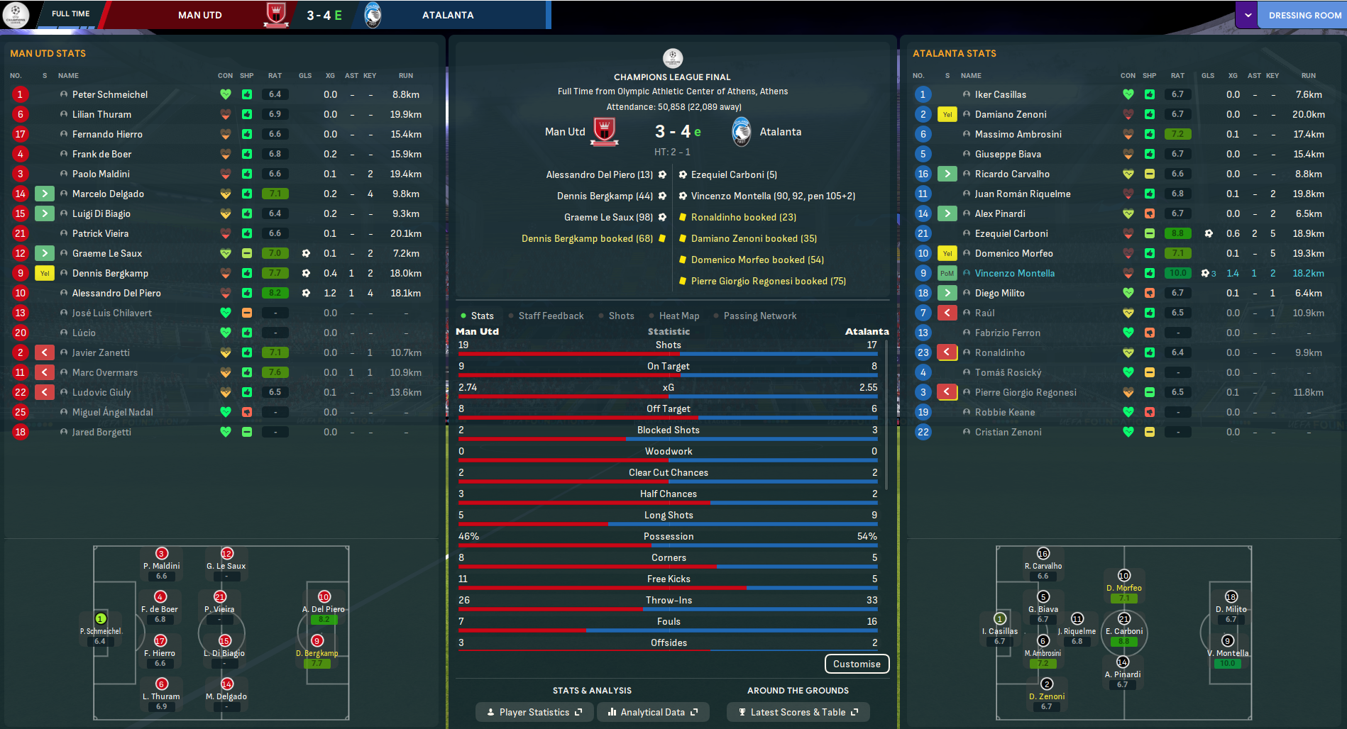 That took the game to extra time, so Lombardi had to drop back into a more familiar formation. And his team again started well as the same duo combined to finish off a superb passing move, as Carboni picked the ball up in midfield and threaded a ball through for Montella to calmly tuck the ball into the far corner. United, having done nothing for 50 minutes, suddenly woke up and equalised again through Le Saux. But Atalanta fired back again in injury time as Riquelme was taken out close to the edge of the box and, without VAR, a penalty was awarded, which Montella coolly converted for his hat trick. Nothing happened after the break as Lombardi killed the game and United ran out of steam.