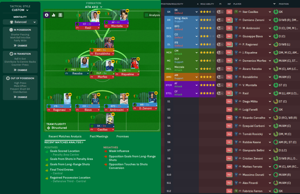 Ronaldo’s departure saw Lombardi fully shift towards the 3-4-1-2 he’d introduced towards the end of last season. Ronaldinho tucks in behind Montella and Raúl and the midfield 3 is pretty special.