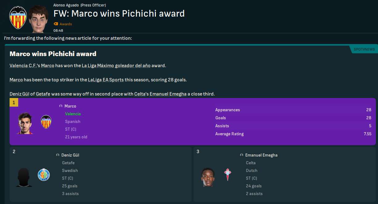 Valencia finished 4th with 78 points after 24 wins, 6 draws and 8 defeats, scoring a new club record 94 and conceding 43, which was the most they’d conceded in Lazaró’s reign. However, Marco was not only the top goalscorer with 28 in 30, which equalled Mundo’s club record tally set back in 1944, but also the best player with a 7.55 average rating. Guerra was level with him on 7.55 and topped the league assists with 13. That saw Marco win Premio Don Balón Jugador del año (best player), with Guerra in 2nd, and Mejor Jugador joven del año (best young player) as week as the Pichichi awarded for Máximo goldador del año.