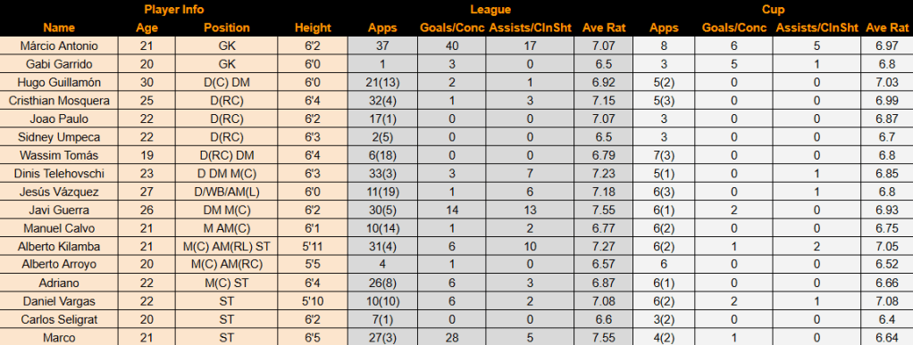 Marco was undoubtedly Valencia’s star man this season, answering his manager’s need for a goalscorer by bagging 29 in 34 with 5 assists. Guerra was again superb with 16 goals and 13 assists, making it 4 consecutive seasons he’s racked up double figures for goals and assists. Salsano, who became the first Valencia player to win European Golden Boy, stepped up a level with 15 goals and 10 assists, as did Alberrto Kilamba with 7 goals and 11 assistsm Daniel Vargas with 8 goals and 3 assists and left back David Fernandez Vinitzky, who made his Argentina debut in March, with 9 assists.